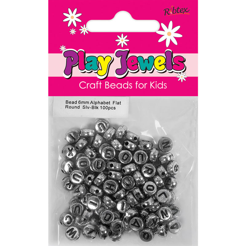 BEAD 6MM ALPHABET FLAT RND SLV BLK 100PC