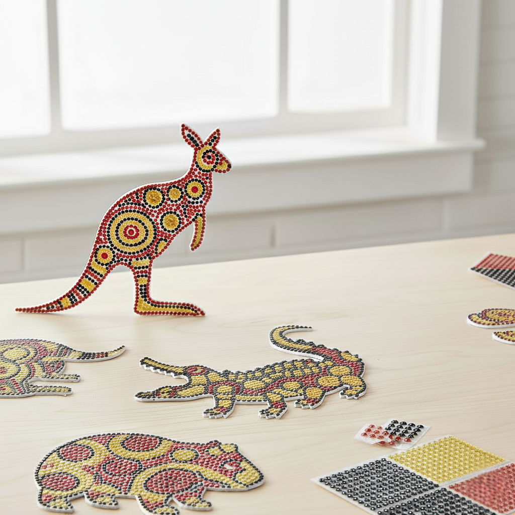 Sticker sheets of Red Yellow and Black, Aboriginal colours, great to teach friendship, Culture & history.Using thse self-adhesive rhinestones with the flat cardboard animal shapes is a brilliant idea, especially for an activity inspired by "Welcome to Country" or general Australian animal crafts. The black, yellow, and red rhinestones are also significant colors often found in Indigenous Australian flags and art, adding another layer of meaning.Not suitable for children under 4 years old